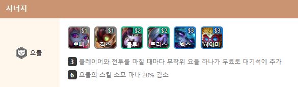 시즌5의 용족 시너지처럼 전투가 끝난후에 요들 유닛이 하나씩 무작위로 대기석에 등장합니다.